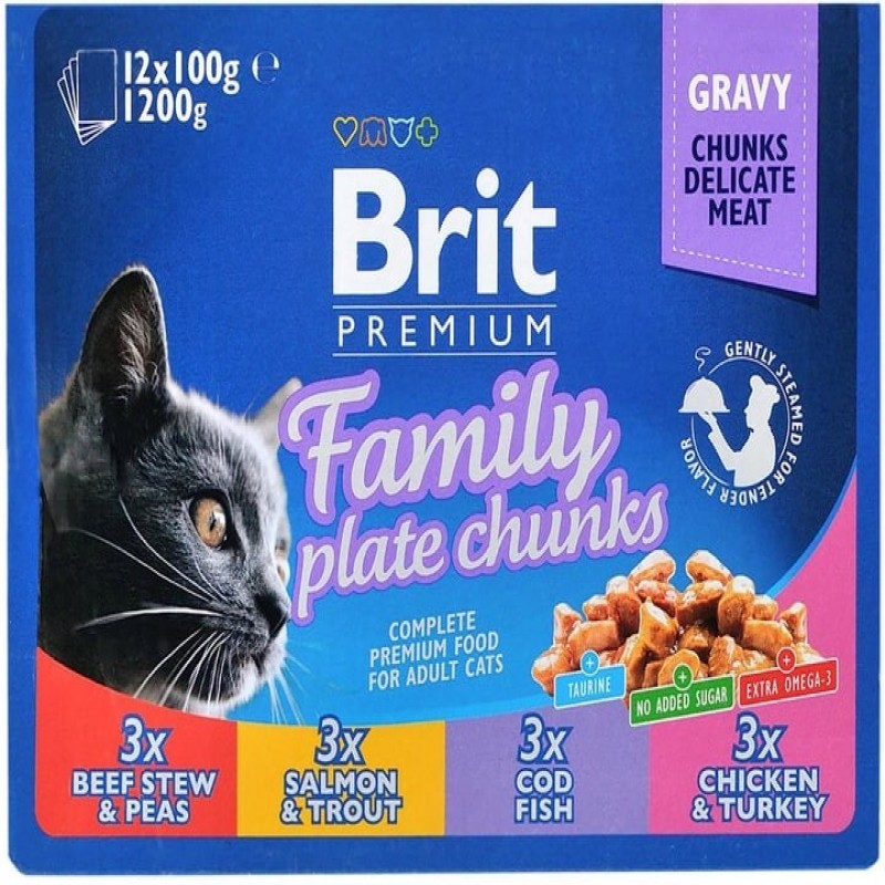 Упаковка вологого корму для кішок Brit Premium сімейна тарілка асорті 4 смаку 100 г х 12 шт (8595602